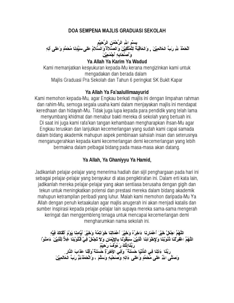 Sebagai contohnya bacaan doa bersempena. Ya Allah Ya Tuhan kami kau terbitkanlah rasa kebesaran di dalam setiap hati murid-murid yang menerima hadiah. Click here to load reader.